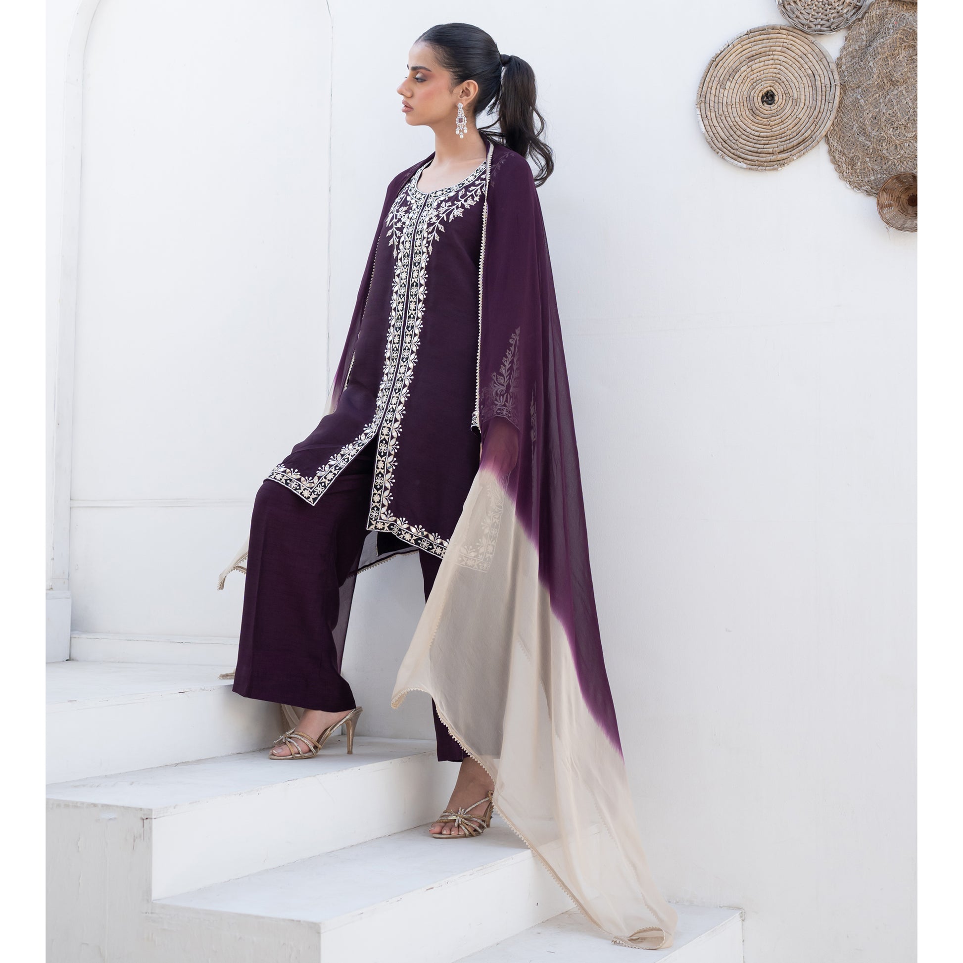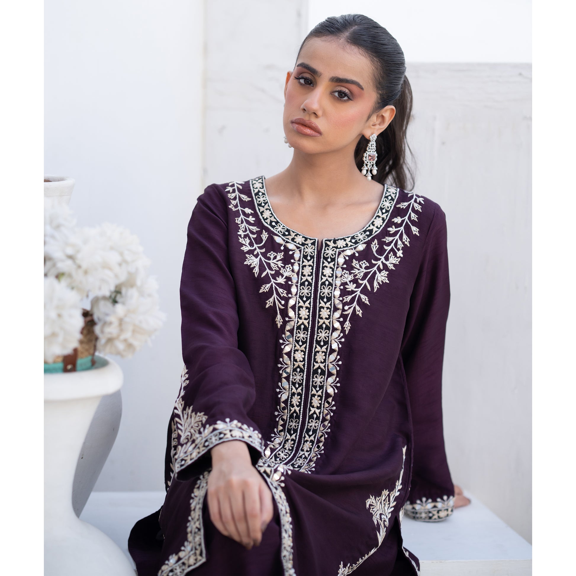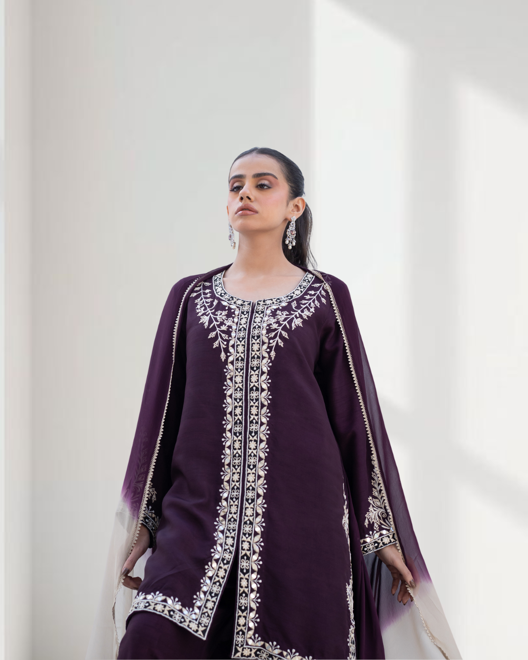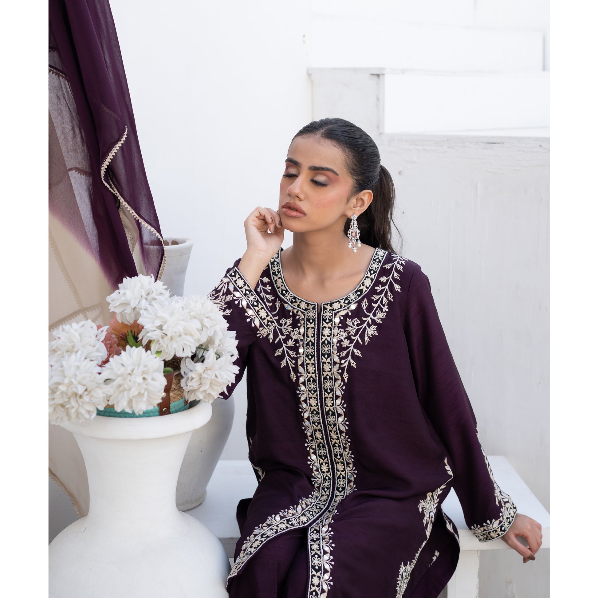 Where classic elegance meets contemporary trends. Designed in rich Khaddi silk and complemented by a silk dupatta with delicate edging, this ensemble is a perfect blend of tradition and modernity.