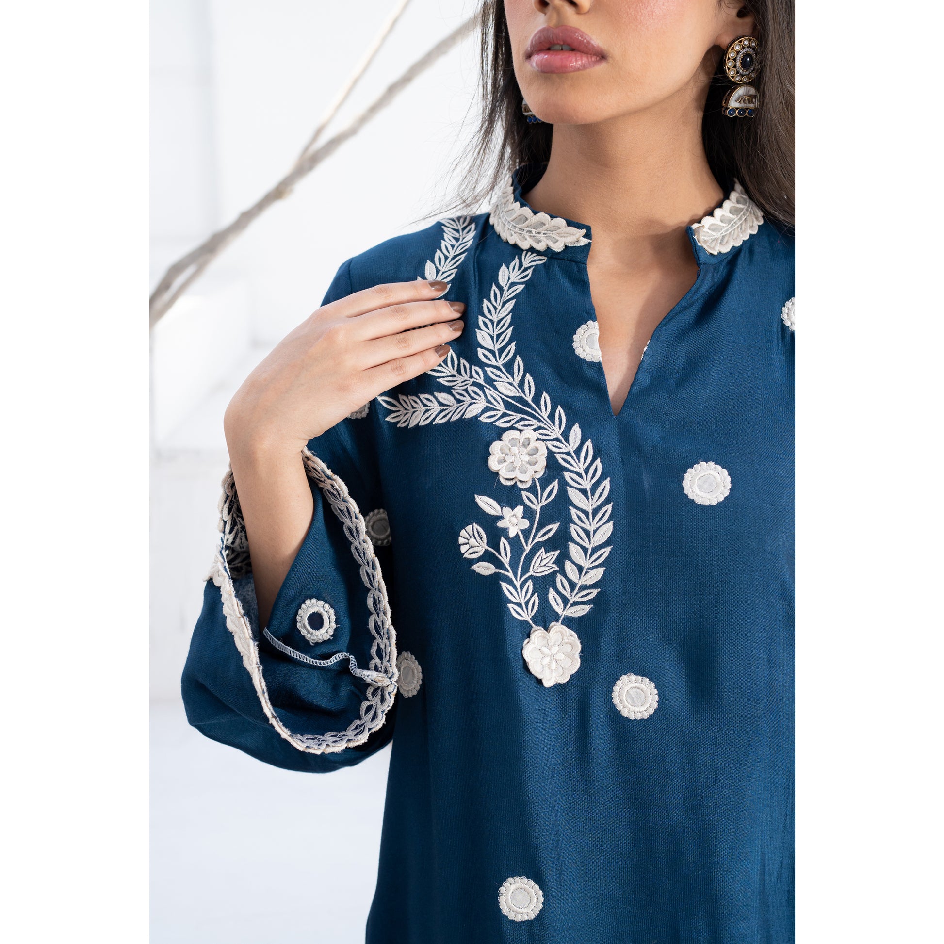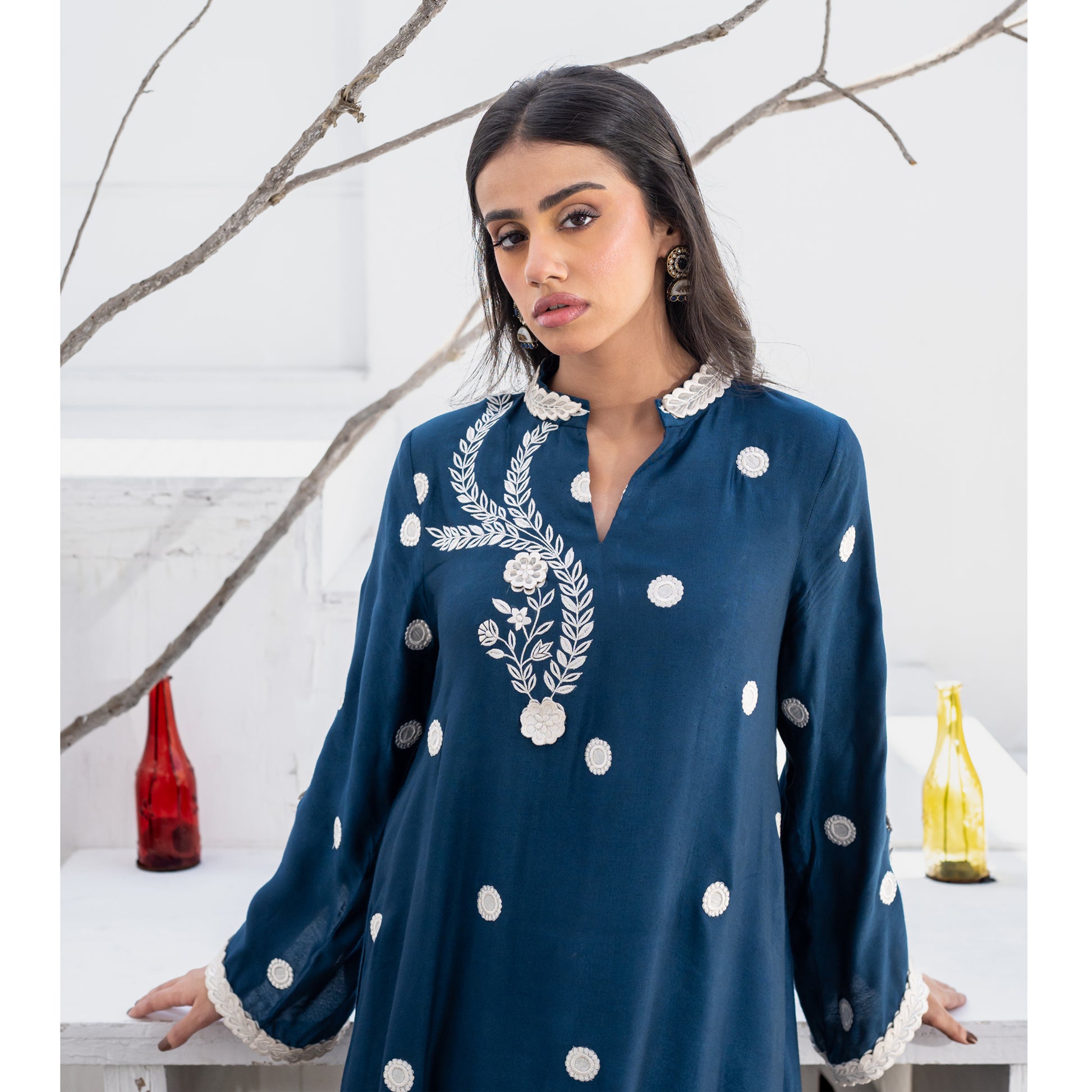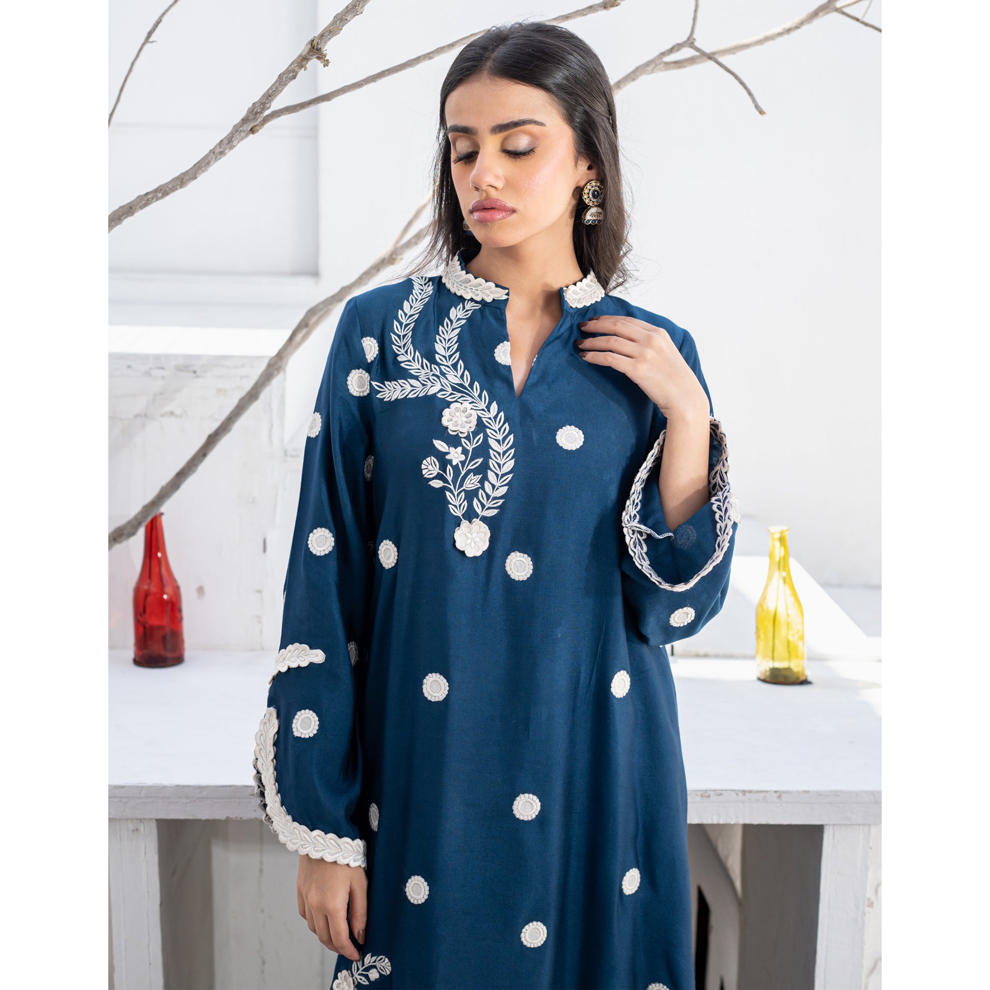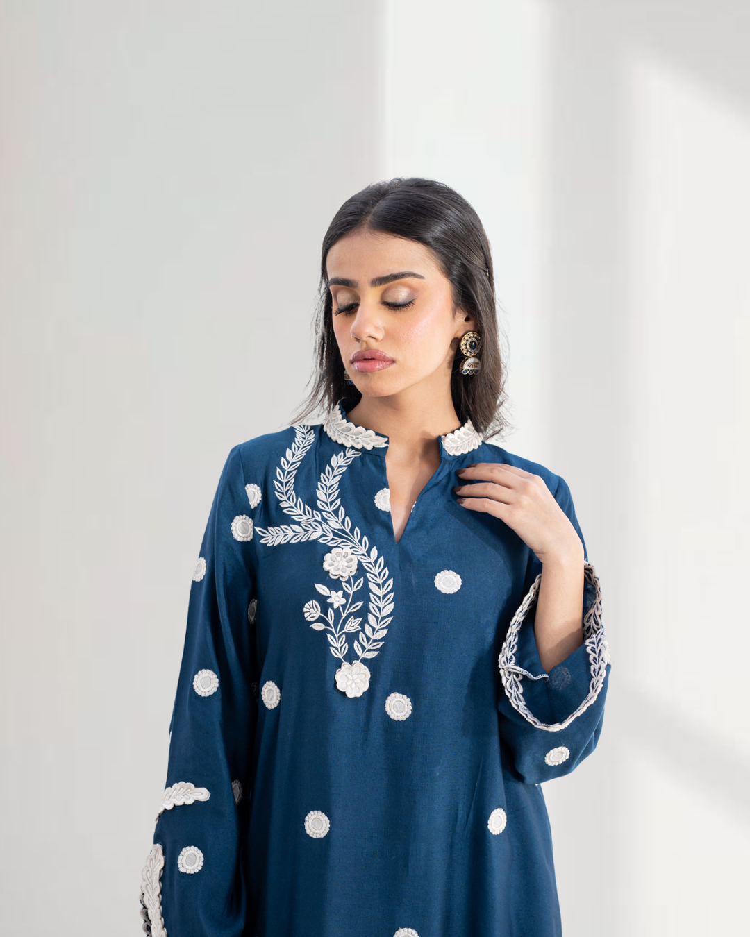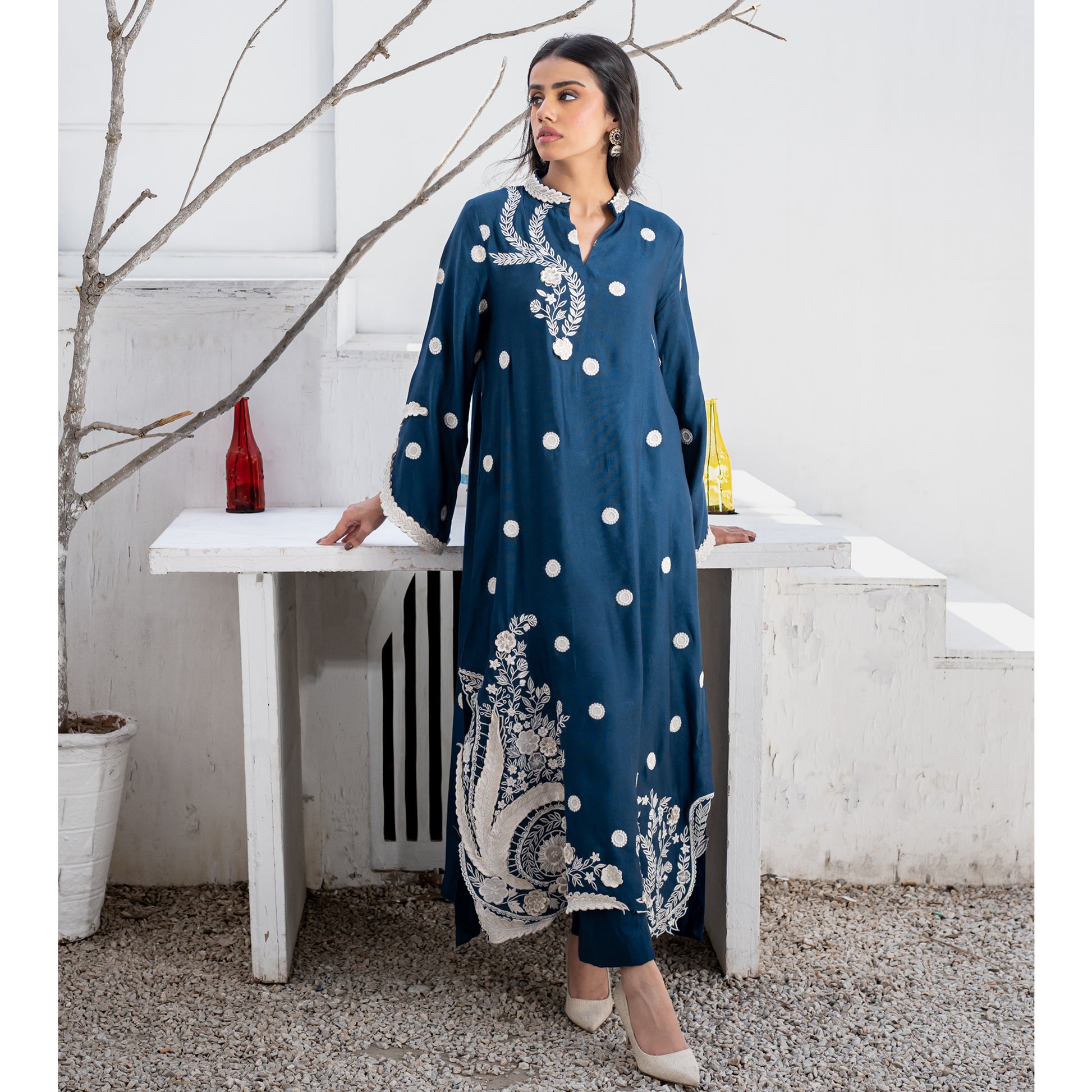 A Perfect Blend of Elegance and Ease Adorned with heavy embroidery along the daman and delicate detailing on the neckline,this outfit is a timeless statement. Paired with a scalloped dupatta and finely edged pants, this ensemble exudes effortless grace.