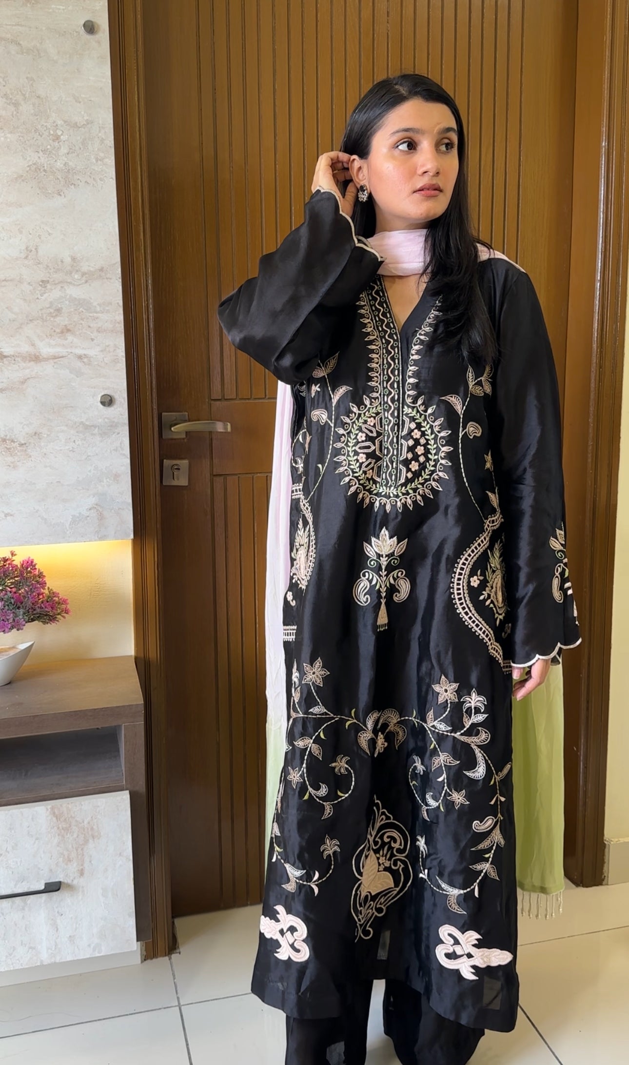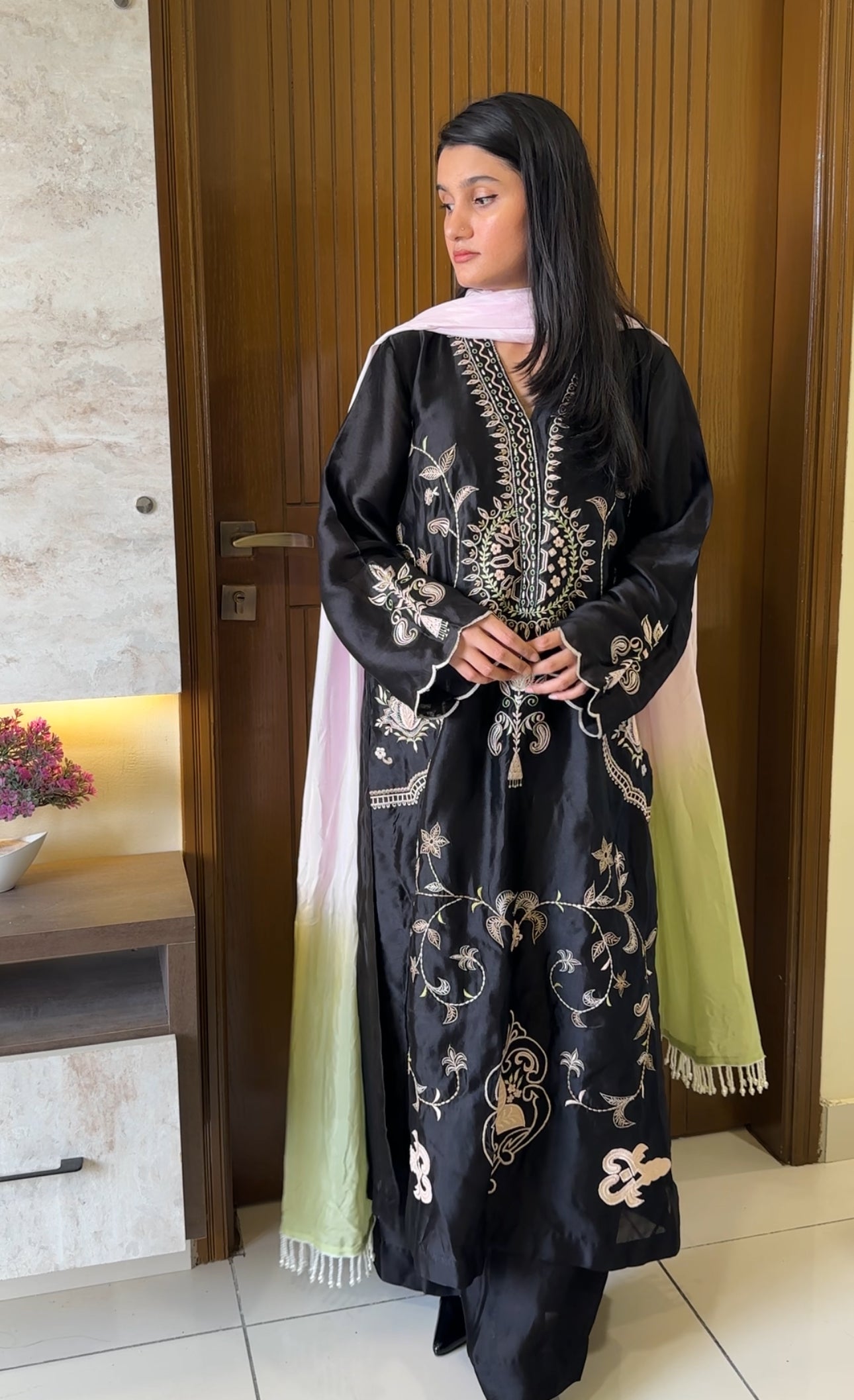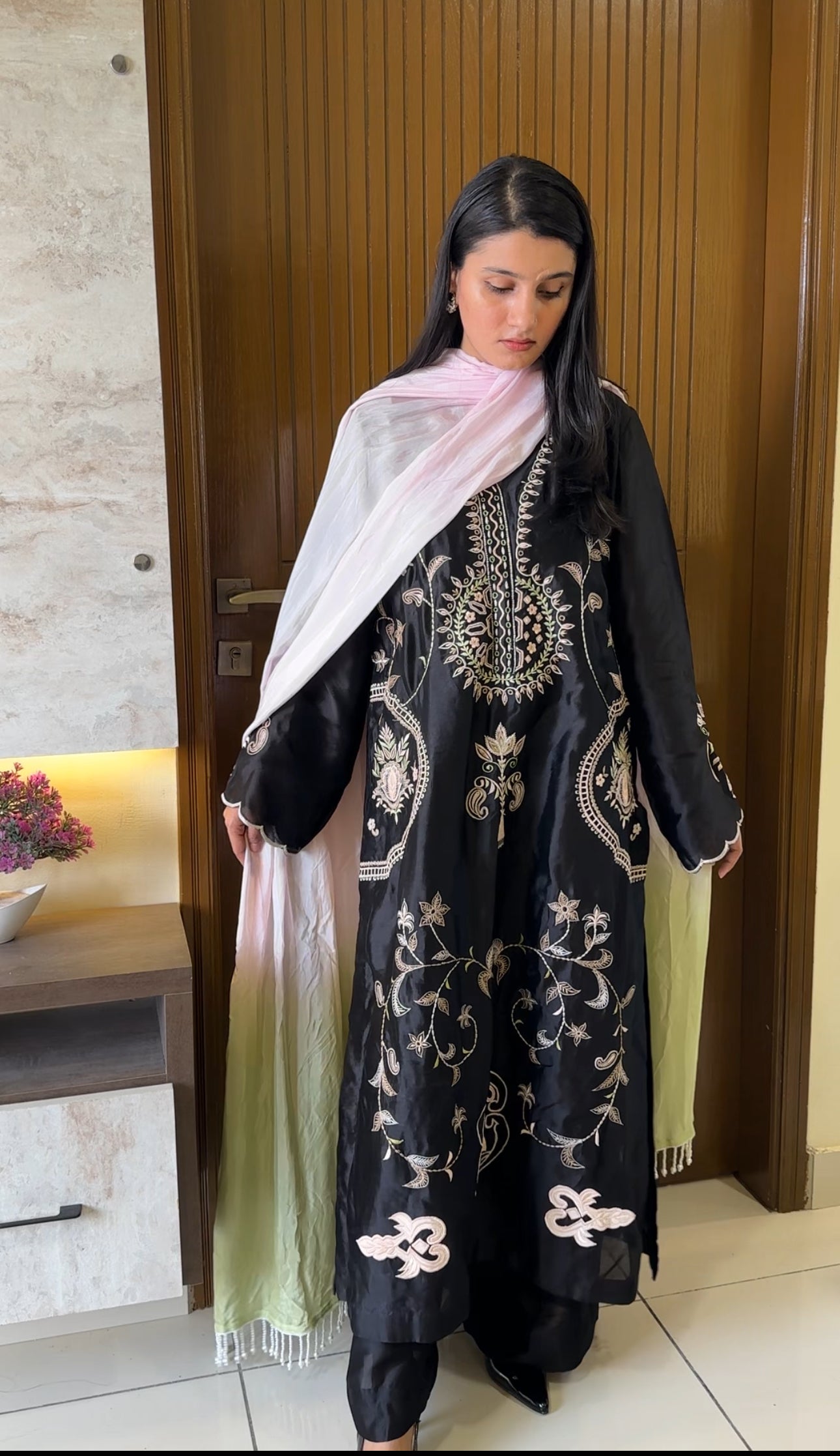 A captivating black ensemble crafted from luxurious shisha silk, beautifully adorned with delicate floral embroidery in soft shades of pink and mint green. The gracefully designed neckline and intricate appliqué motifs along the sides and daman — paired with a worked back — evoke timeless charm. Scalloped sleeves lend a touch of femininity, while the jaal detailing along the sides adds depth and sophistication. Completed with a two-toned medium silk dupatta, elegantly finished with pearl edging, this ensemble is a perfect blend of boldness and grace — made for the woman who carries poise in every hue.